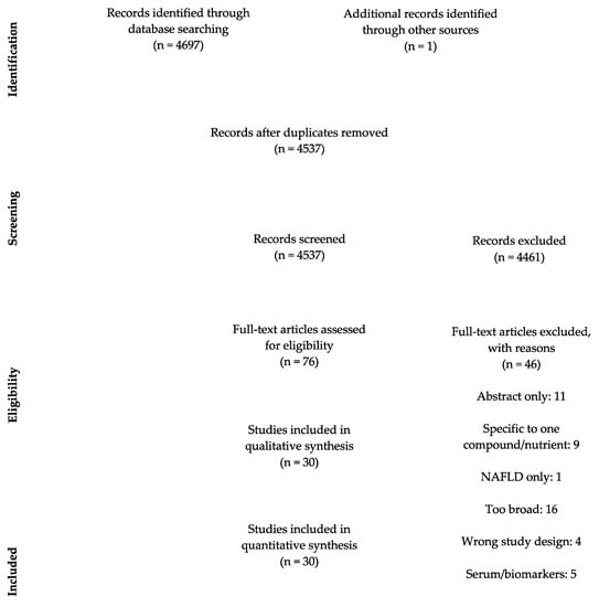 The literature search process is shown in Figure 1. The initial search resulted in 4698 articles, of which 4461 articles did not fit the inclusion criteria. Seventy-six studies were eligible for full text screening and 46 of these were excluded for the following reasons: abstract only (n = 11), included only one nutrient (n = 9), wrong article type or study design (n = 4), too broad such as studying overall lifestyle habits rather than a focus on diet (n = 16), looking at MAFLD not HCC (n = 1) and looking at serum/biomarkers (n = 5). There were 30 observational studies included in the systematic review [4,7,10,14,20,21,22,23,24,25,26,27,28,29,30,31,32,33,34,35,36,37,38,39,40,41,42,43,44,45].