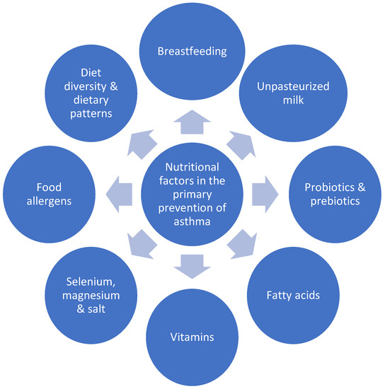 In this paper, we aim to discuss the current knowledge about nutrients application in asthma primary prevention (Figure 1). We present the newest research, both on single components of the diet and the whole dietary patterns, propose mechanisms of action at different stages of life and discuss future perspectives.