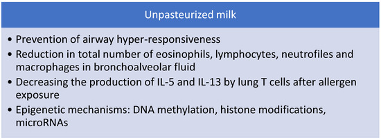 The components of raw milk (PUFA, bacteria, proteins and vitamins) may also act via epigenetic mechanisms. Changes in gene expression by non-DNA-encoded alterations such as DNA methylations, histone modifications and exosomes immune influence via microRNAs seem to be some of the most important anti-asthmatic and anti-allergic pathways of action [24]. Short non-coding RNA sequences (miRNAs) regulate post-transcriptional gene expression, exerting an immune regulatory function and interfering in allergic inflammation. miRNAs may potentially be implicated in the induction of the allergy lymphocytes profile and other miRNAs in promoting regulatory T cells associated with allergen tolerance [25]. They are present in raw cow’s milk and may potentially interfere with asthma genes, reducing the risk of the disease [26]. However, in the GABRIELA study, despite the differences in total miRNA quantities in farm and shop milk, it did not explain the protective effect of unpasteurized milk [27].