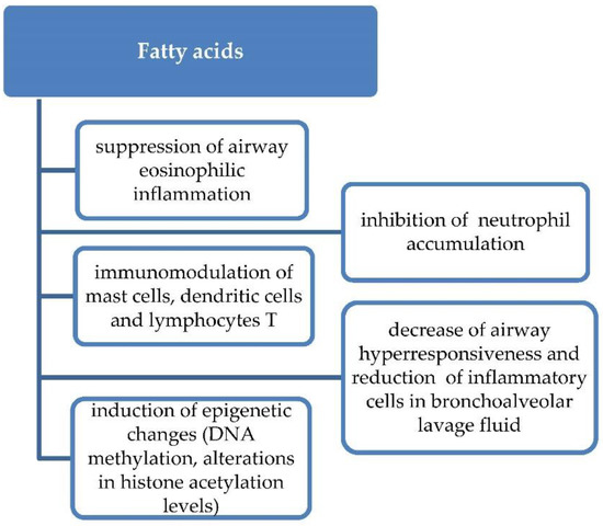 There is an increasing body of evidence both from experimental and clinical studies that PUFA are involved in asthma inflammation at different levels [44,45]. In a murine model, inhalation of omega-3 fatty acid docosahexaenoic acid (DHA) during allergen challenge reduced the number of inflammatory cells in BAL and suppressed airway eosinophilic inflammation and airway hyper-responsiveness [46]. Moreover omega-3 PUFA-derived mediators reduced neutrophil accumulation in the inflammatory sites and directly regulated many inflammatory cells such as eosinophils, T cells, mast cells and dendritic cells. Dysregulated PUFA metabolism was observed in patients with severe asthma [47]. Recently, it was shown that n-3 LCPUFA intake in pregnancy may induce epigenetic changes in methylation levels of specific genes in offspring, regulating fatty acids desaturase and elongase, and, by that, may modulate childhood wheeze and asthma risk [48]. Moreover, maternal fish and oil consumption may influence the alteration in H3 and H4 histone acetylation levels at immune regulatory genes such as the CD14 gene in placenta or the T cell protein kinase C gene promoter in cord blood and, in this way, may regulate and modify immune responses in neonates [49,50].