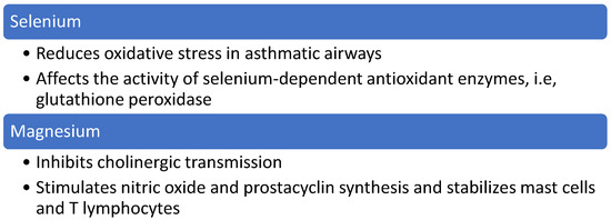 Selenium has the potential to reduce oxidative stress in asthmatic airways and inflammation related to asthma pathogenesis by affecting the activity of selenium-dependent antioxidant enzymes, for example, glutathione peroxidase. This enzyme is responsible for catalyzing the reduction of hydrogen peroxide, lipid and phospholipid hydroperoxides by the antioxidant glutathione in airway epithelial lining fluid. Selenium supplementation inhibits the nuclear factor-kB activity and, in this way, limits the development of the inflammatory process in asthma [97]. In this way, a higher intake of selenium could potentially suppress asthma inflammation. Low dietary selenium intake increased asthma risk in the adult population [98]. However, the effect of selenium supplementation on objectively measured asthma symptoms was not confirmed [97]. The correlation between selenium and asthma primary prevention has not been investigated in interventional studies.