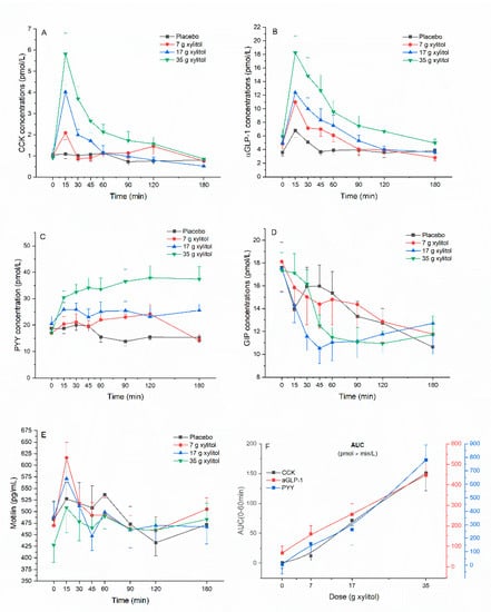 For CCK, aGLP-1 and PYY the dose–response relationship was evaluated and shown in Figure 1F. On average, all these hormones showed a monotonically increasing curvilinear secretion with increasing xylitol dose. For none of the hormones an apparent saturation of the stimulating effect was observed, so that no half-maximal stimulating dose (ED50) could be estimated.
