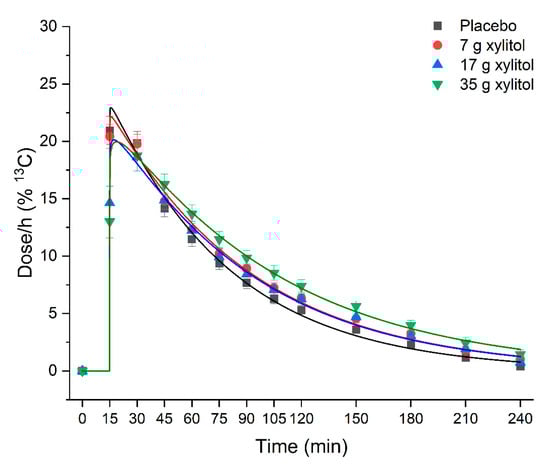 Xylitol leads to a dose-dependent deceleration of gastric emptying rates compared to placebo (Figure 2, Table 2). There was an overall statistically significant difference comparing T50% (p = 0.026). Pairwise comparisons revealed that time needed to empty 50% of the dose was significantly shorter for placebo vs. 35 g xylitol (56.6 ± 13.0 min vs. 74.0 ± 18.1 min; p = 0.029). Goodness of fit parameter R2 were between 0.992 and 0.999 for all treatments.