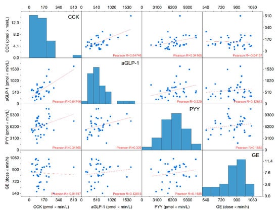 To explore putative relationships between different gut hormone responses (e.g., CCK, aGLP-1, and PYY) and gastric emptying of the different treatments, the integrated responses (iAUC 0–60 min) were correlated on an individual basis by linear matrix correlation. The goodness of this correlation was expressed by Pearson’s correlation coefficient, R.