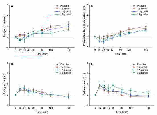 Appetite-related sensations: No effect of xylitol treatment on appetite-related sensations could be found: The values of iAUC 0–60 min, iAUC 0–180 min and iCmax did not show any overall statistically significant differences (Figure 4A–D).