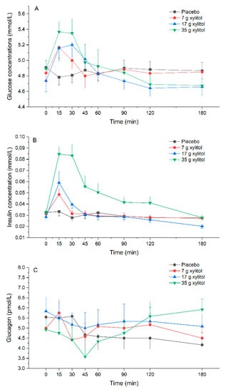 Another important player in glycemic control is the pancreatic hormone glucagon—a hormone produced in the α-cells of the pancreatic islets—which stimulates hepatic glycogenolysis and gluconeogenesis in hypoglycemic states to restore glucose homeostasis, and in this way counter-balances insulin. Effects of acute or chronic intake of xylitol on glucagon secretion have not been studied so far. In the current trial, we found no statistically significant effects of different doses of xylitol on plasma glucagon concentrations in this group of lean, healthy volunteers. However, the highest xylitol dose (35 g) lead to numerically and statistically significant higher late (120 min) glucagon concentrations compared to 17 g without a concomitant increase in plasma glucose concentrations. In order to be able to make a definitive statement as to whether or not xylitol has any effect on glucagon release, further studies would certainly be useful, preferably with longer observation times (>180 min).