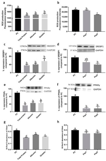 Digested total protein (DTP), digested albumin and glutelin (Figure S1) and pure peptides showed a high cell viability, demonstrating that these samples do not interfere with cell growth and normal cell metabolism (Figure S2). Furthermore, these samples reduced ROS production (p < 0.05) (Figure 1a,b). DTP, digested albumin and glutelin and Pep2 (pure peptide 2: RMVLPEYELLYE) reduced expression of sterol regulatory element-binding protein 1 (SREBP1) by −63.4, −58.8, −53.3 and −46.7%, respectively (p < 0.05) (Figure 1c,d). The expression of PPARγ was reduced by DTP, digested albumin and glutelin and pure peptides, primarily by Pep2 (−77.1%; p < 0.05) (Figure 1e,f).