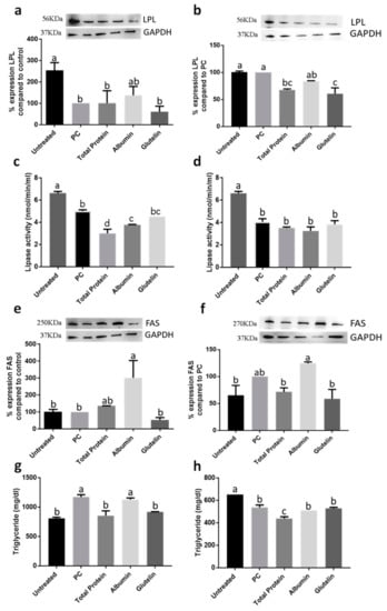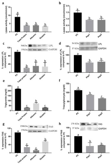Every treatment with DTP, digested albumin and glutelin and pure peptides, Pep1 (pure peptide 1: NSPGPHDVALDQ) and Pep2, reduced lipid accumulation (Figure 1g,h and Figure S3), especially by DTP (−37.2%; p < 0.05). Moreover, the activity of lipase was also reduced by −58.3%, −56.9% and −62.6% by DTP, digested albumin and glutelin, respectively (p < 0.05) (Figure 2a). However, reduction by pure peptides was −37.8%, in comparison to the positive control (Figure 2b). Every sample reduced (p < 0.05) lipase lipoprotein (LPL) expression (Figure 2c,d), triglyceride content (Figure 2e,f) and fatty acid synthase (FAS) expression (Figure 2g,h). DTP reduced the content of triglycerides and FAS expression by −85.7% and −71.6%, respectively (p < 0.05).