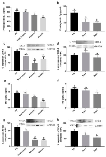 Digested albumin and glutelin but not DTP, were effective on reducing the secretion of prostaglandin-2 (PGE2) (p < 0.05) (Figure 3a). Pure peptides Pep1 and Pep2 reduced PGE2 secretion by −49.3 and −54.1%, respectively (p < 0.05) (Figure 3b). Digested albumin and glutelin also reduced the expression of cyclooxygenase-2 (COX-2) in −68.1 and −48.1%, respectively (p < 0.05). However, DTP and pure peptides had no effect (p < 0.05) (Figure 3c,d). The secretion of tumor necrosis factor alpha (TNF-α) was reduced by digested albumin, glutelin and Pep2 (p < 0.05) (Figure 3e,f); all proteins reduced NF-κB expression, particularly glutelin (−69.3%; p < 0.05) (Figure 3g,h). Glutelin, Pep1 and Pep2 reduced the secretion of IL-6 in −28.4%, −18.9% and −33.8%, respectively, as compared with PC (positive control) (p < 0.05) (Table S1). In addition, pure peptides decrease the IL-10 secretion (Table S1) (p < 0.05). IL-12 secretion (Table S1) and nitric oxide (NO) production (data not shown) were not statistically different to PC (p > 0.05).