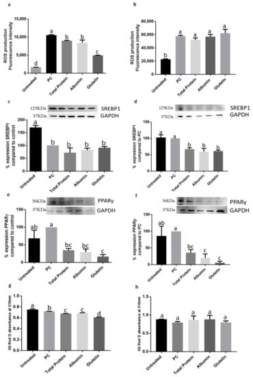 The expression of SREBP-1 was not reduced by preventing inflammation (p > 0.05) (Figure 4c) but on inhibition, DTP and digested albumin and glutelin reduced the expression of this protein in −33.0%, −40.8% and −38.7%, respectively (p < 0.05) (Figure 4d). The use of DTP and digested albumin and glutelin in both, prevention and inhibition of induced inflammation, decreased the expression of PPARγ (p < 0.05). Glutelin reduced PPARγ expression in −83.2% and −94.2% in prevention and inhibition of induced inflammation, respectively (p < 0.05) (Figure 4e,f). The Oil red-O accumulation was reduced on prevention experimental approach by all proteins (p < 0.05) (Figure 4g) but not for the inhibition approach (p > 0.05) (Figure 4h).
