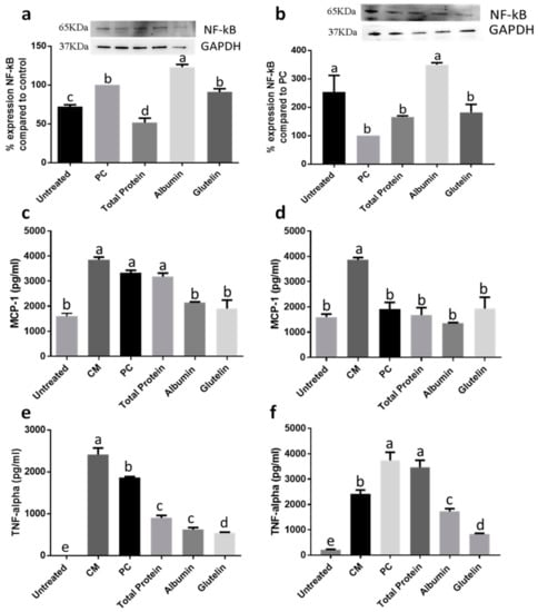 NF-κB expression was reduced only by DTP in the prevention treatment approach (−48.4%; p < 0.05) (Figure 6a). During inhibition, any sample showed effect for this marker (p > 0.05) (Figure 6b). The monocyte chemoattractant protein-1 (MCP-1) secretion was reduced −35.8% and −42.8%, respectively by digested albumin and glutelin during the prevention process (p < 0.05) (Figure 6c). However, any protein reduced MCP-1 during inhibition of induced inflammation (p > 0.05) (Figure 6d). Every protein reduced TNF-α secretion in prevention (−51.6% to DTP, −66.6% to digested albumin and −70.9% to digested glutelin; p < 0.05) (Figure 6e) and only digested albumin and glutelin reduced the secretion of this cytokine on inhibition of already produced inflammation (−53.8 to digested albumin and −77.9% to digested glutelin; p < 0.05) (Figure 6f).