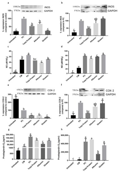 Effect of digested total protein and digested albumin and glutelin from chia seeds to prevent and inhibit the inflammation in mature adipocytes stimulated by inflamed macrophages. iNOS expression on prevention (a) and inhibition (b); NO secretion on prevention (c) and inhibition (d); COX-2 expression on prevention (e) and inhibition (f); PGE2 secretion on prevention (g) and inhibition (h). Untreated receive any treatment, PC receive only the CM. All experiments were performed in at least two independent trials run with triplicate data points. Different letter per column means statistically different among the proteins by ANOVA and post-hoc Tukey-test (p < 0.05). CM: conditioned media; iNOS: inducible nitric oxide synthase; GAPDH: glyceraldehyde 3-phosphate; NO: nitric oxide; COX-2: cyclooxygenase2; PGE2: prostaglandin 2; PC: Positive control.