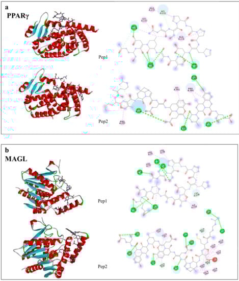 The in silico interaction of the peptides NSPGPHDVALDQ (Pep1) and RMVLPEYELLYE (Pep2) found in digested glutelin, with PPARγ (a) MAGL (b) and FAS (c). These analyzes were performed by AutoDock Vina® and visualized by Discovery Studio 2016 Client®.
