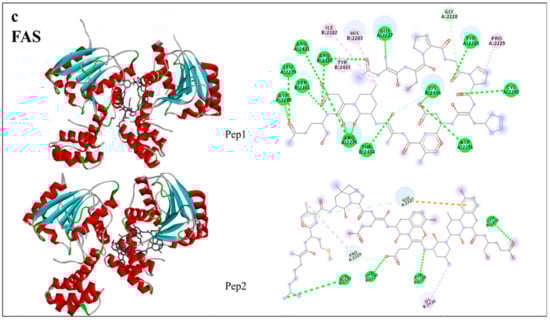 Peptides NSPGPHDVALDQ (Pep1) and RMVLPEYELLYE (Pep2) showed interactions with enzymes FAS and monoacylglycerol lipase (MAGL) and PPARγ receptor, related to the adipogenesis process. Pep2 showed the highest interaction with PPARγ by lowering the estimated free energy (EFE) (−6.9 kcal/mol) (Figure 8a) and with MAGL by also lowering EFE (−7.3 kcal/mol) (Figure 8b). However, Pep1 had the highest interaction with FAS (−7.3 kcal/mol) (Figure 8c). Other identified peptides in chia seed, peptides TGPSPTAGPPAPGGGTH and YLGAHPGTAN, both from digested albumin, showed the highest interaction with PPARγ (−9.1 kcal/mol) and MAGL (−7.8 kcal/mol), respectively. The peptide APSPPVLGPP from DTP, showed the highest interaction with FAS (−9.8 kcal/mol). These values were lower (more interaction) than the pharmacological controls tested, which showed EFE: −8.5, −7.4 and −5.5 kcal/mol, respectively for PPARγ, FAS and MAGL (Table S2).