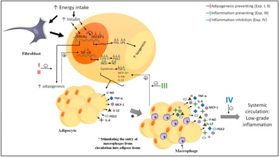 Proposed mechanism of the effect of DTP, digested albumin, digested glutelin or pure peptides in the prevention of adipogenesis (experiments I and II, the red symbols), in the prevention of inflammation (experiments III, the green symbols) and inhibition of establishing inflammation (experiments IV, the blue symbols). Red symbols: On prevention of adipogenesis, DTP, digested albumin, glutelin and pure peptides reduced the expression of PPARγ, SREBP1, FAS, lipoprotein lipase (LPL), nuclear factor-kappa B (NF-κB), cyclooxygenase-2 (COX-2), and inducible nitric oxide synthase (iNOS) and the secretion of PGE2, TNFα and albumin and pure peptides decrease the levels of IL-6. Green symbols: On prevention of inflammation, DTP, digested albumin and glutelin decreased the expression of PPARγ, COX-2 and iNOS and the NO, PGE2, TNFα secretion. DTP reduce the NF-κB expression. Digested albumin and glutelin reduced the MCP-1 secretion. Blue symbols: On inhibition of inflammation, DTP, digested albumin and glutelin decreased the expression of PPARγ and SREBP1. DTP reduce the expression of LPL, FAS, iNOS, COX-2, the triacylglycerol content, lipase activity, NO secretion. Digested albumin reduced the lipase activity and the secretion of NO, PGE2 and TNFα. Digested glutelin decreased the expression of LPL and FAS and TNFα secretion. DTP: digested total protein; PPARγ: peroxisome-proliferator-activated receptors gamma, SREBP1: sterol regulatory element-binding protein-1, FAS: fatty acid synthase, LPL: lipoprotein lipase, NF-κB: factor nuclear kappa B, COX-2: ciclooxigenase-2, iNOS: inducible nitric oxide synthase, MCP-1: Monocyte chemoattractant protein-1, NO: nitric oxide, PGE2: prostaglandin E2, IL-6: Interleukin 6.