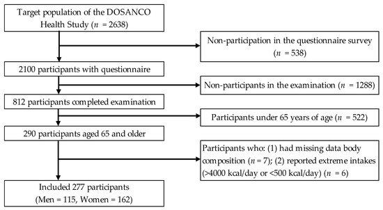 A total of 2100 participants (977 men and 1123 women) completed the questionnaire survey (response rate: 79.6%). Of these, 812 subjects participated in the anthropometric survey, and 290 participants aged ≥ 65 years were eligible for the present study. We excluded 13 participants for the following reasons: (1) missing data on body composition (n = 7) and (2) extreme energy intakes (>4000 kcal/day or <500 kcal/day; n = 6). Finally, we included 277 patients (115 men and 162 women) for the analysis in the present study. An overview of the study procedures is presented in Figure 1.