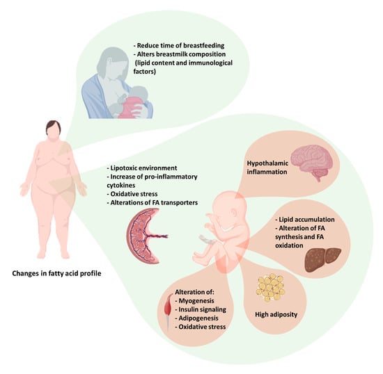 Maternal obesity is associated with changes in circulating fatty acid (FA) profile and placental alterations including a lipotoxic environment, a pro-inflammatory state, and elevated oxidative stress, that altogether lead to modifications in FA transporters that affect the development of fetal organs such as the brain, liver, adipose tissue, and skeletal muscle. Moreover, maternal obesity reduces the time of breastfeeding and alters the FA composition of breast milk.