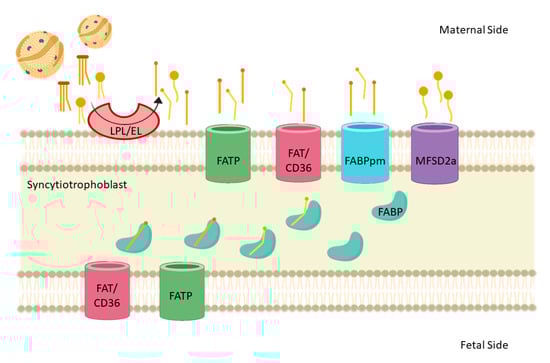 Schematic representation of placental fatty acid transport. Maternal triglycerides are hydrolyzed to non-esterified fatty acid (NEFA) by placental lipases (lipoprotein lipase (LPL) and endothelial lipoprotein lipase 9 (EL9). Then, the placenta can uptake and move the NEFA across the membrane through a flip-flop mechanism or with the help of binding proteins and transporters. FABP: fatty acid binding protein; FAT/CD36: fatty acid translocase; FATP: fatty acid transport protein; MFSD2a: main facilitator superfamily domain containing 2a; FABPpm: plasma membrane’s fatty acid binding protein.