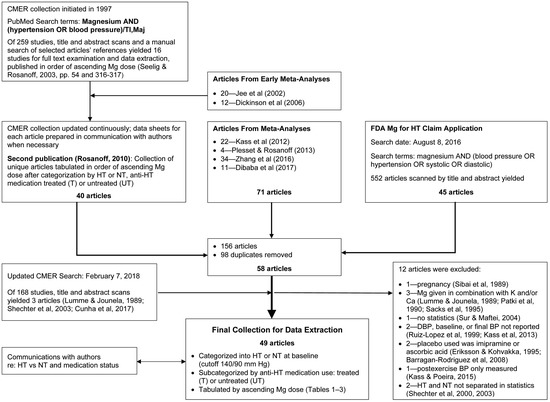 A.R.: creation and maintenance of CMER collection of oral magnesium for BP studies, initial and follow-up searches, scanning and article selection, data extraction, data analysis, correspondence with study researchers, design of categorization, tabulation, and writing. R.B.C.: article evaluation, data extraction, expert consultation, and writing. G.H.J.: performed independent search for the FDA-qualified health claim petition, article scanning and selection, data extraction, evaluation of studies by FDA criteria, and writing. All authors have read and agreed to the published version of the manuscript.