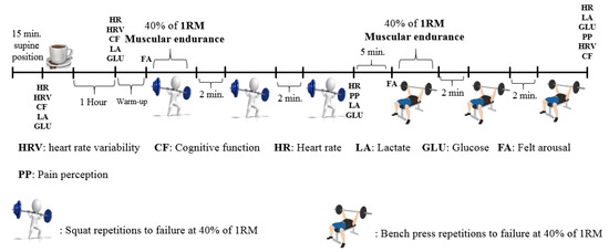 A double-blind, randomized, counter-balanced, crossover research design was used. Each participant attended the laboratory on five occasions, separated by 48–72 h to allow recovery. The arrangements concerning session order, timing, and blinding was conducted by a researcher who was not involved in data collection and analyses. The first two sessions were used for familiarization and the following three sessions were employed to complete the test protocol with the ingestion of 6 mg/kg/bm of caffeine provided from coffee (6COF), 3 mg/kg/bm of caffeine provided from coffee (3COF), and decaffeinated coffee (PLA) before the exercise protocol. Body composition (Jawon Segmental Avis 333 Plus, Korea) and 1 RM tests were measured in familiarization sessions. Strength (1 RM) tests were completed according to protocols outlined by Baechle and Earle [39] and Richardson and Clarke [10]. In order to measure muscular endurance performance in the subsequent sessions, a weight equivalent to 40% of 1 RM was calculated and recorded for each exercise, proportionally to the higher 1 RM value established from two familiarization sessions. Participants were introduced to the felt arousal (FA) scale [40] and valid muscle pain perception scale (MP) [41] used in previous studies [4,10] to monitor arousal and muscle pain throughout the protocol. MP scale described by Cook et al. [41], which ranged from 0 to 10, with 0 representing “no pain at all” and 10 “extremely intense pain” was used. Participants also practiced with the cognitive function (CF) test on the computer until achievement of consistent scores. Upon arrival at the testing site, participants undertook HRV and CF measurements followed by coffee ingestion, and were allowed 1-h passive rest in the seated position, and to consume 500 mL of water once the coffee mug was emptied. Then, HRV and CF tests were repeated. Following these tests, participants completed 5 min jogging on a treadmill and standardized static-dynamic stretching. Static stretching targeted the quadriceps and hamstrings, while participants laid in a supine or on their sides and arms, with a 90 degree bend in the arm, pushed straight across the front of the body, or pushed back and down the back of the body behind the head, which was executed for 30 s with a 30 s rest, followed dynamically by two stretches while standing—one for the upper body and another for the lower body—such as moving one arm forward or backward in a diagonal plane, and one leg backward and then forward in a sagittal plane (which took about 30 s for each exercise) [42]. Then participants started the 3 sets of 40% of 1 RM repetitions to failure squat protocol, with a 2-min rest between sets. The same protocol was replicated for the bench press after a 5 min passive rest period. Immediately after muscular endurance tests, HRV and CF were measured, respectively. Heart rate (HR) (Polar Team 2 telemetric system, Finland), capillary lactate (LA) (Lactate Scout, USA), and glucose (GLU) (Accutrend Plus, Roche Diagnostics, Mannheim, Germany) from a fingertip, FA and MP were measured at different time points throughout the test protocol. Figure 1 displayed a schematic of the experimental protocol. Given that participants in this study typically skipped the breakfast due to the congested match and training schedule, all test sessions took place in the early morning hours (6:30–7:30 a.m.), following an overnight fast to simulate their real-life settings. On the day preceding the first session, participants recorded their 24-h dietary intake and then photocopied and handed back to replicate this diet before subsequent sessions. Participants were instructed to avoid caffeine, alcohol ingestion, and strenuous exercise for 24 h prior to the testing sessions. Adherence to diet and avoidance procedures were checked verbally before each session. Although increase in the resistance exercise performance was reported to show a similar magnitude in all three phases of the menstrual cycle [30], cognitive performance [32] and pain perception tolerance appeared to decline [43] in the luteal phase. Therefore, all sessions were performed during the luteal phase of the participants’ menstrual cycle, of which was pursued for 4 months before the onset of the experiment via a mobile application (menstruation calendar—period tracking, TR). Luteal phase was determined by individual declaration of the 20th day from the first day of the menstrual cycle (beginning of menses) [31].