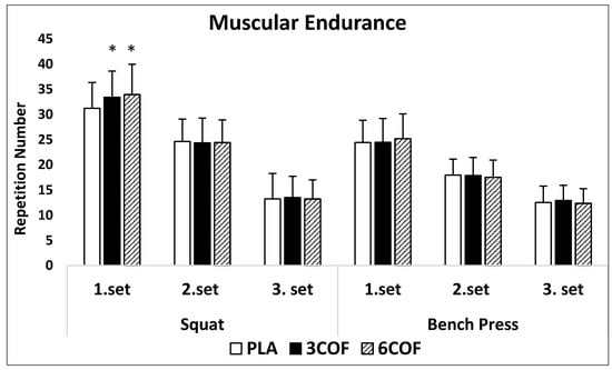 In two-way ANOVA, condition x set interaction (p = 0.01, η2 = 0.30) and main effect for set (p = 0.01, η2 = 0.94) were detected, but there was no main effect for condition (p = 0.11, η2 = 0.13) in squat. One-way ANOVA showed significant differences in squat muscular endurance performance between conditions in the first set (6COF: 33.9 ± 6.0, 3COF: 33.4 ± 5.2, PLA: 31.2 ± 5.1; p = 0.01; η2 = 0.31). Post-hoc analysis revealed that for caffeinated coffee conditions, participants performed significantly more repetitions in 3COF (p = 0.03, 95% CI: 1.2–4.2) and 6COF (p = 0.02, 95% CI = 0.3–5.0) compared to PLA in the first set. There was no significant difference between 3COF and 6COF conditions in the first set (p = 0.93, 95% CI = 0.8–1.8). Further, no significant difference was detected in the second and third sets between all conditions (p > 0.05). No main effect for conditions in the bench press exercise was detected (p = 0.80, η2 = 0.01). There was a significant main effect for set (p = 0.01, η2 = 0.91). In addition, two-way ANOVA showed a trend for condition x set interaction (p = 0.07, η2 = 0.12). Despite non significance, post-hoc analysis pointed a trend in the first set for 6COF condition compared to PLA (p = 0.06, 95% CI = 0.04–1.5). Participants performed more repetitions (3.1%) in the first set of the 6COF condition, in comparison to PLA. There was also no significant difference between 6COF and 3COF (p = 0.47, 95% CI = 0.5–1.9). In addition, there were no significant difference or trend in the second and third sets between all conditions (Figure 2). ICC, for squat, was 0.94 (95% CI = 0.86–0.97), 0.97 (95% CI = 0.95–0.99), 0.96 (95% CI = 0.93–0.98) for the first, second, and third sets, respectively. ICC results from bench press was 0.97 (95% CI = 0.95–0.99), 0.95 (95% CI = 0.90–0.98), 0.94 (95% CI = 0.87–0.97) for the first, second, and third sets, respectively.