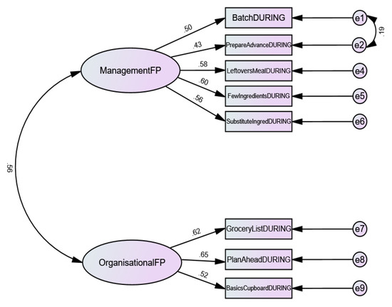Final measurement model for Emergency Situation Food Practices with standardized factor loadings and correlations. FP: Food Practices; e1–9: error term for each variable.