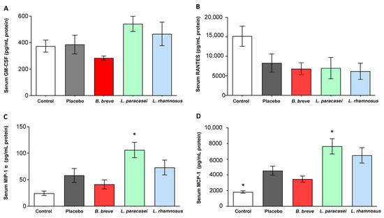 Serum concentration of (A) GM-CSF, (B) RANTES, (C) MIP-1 α, and (D) MCP-1 of rats fed either placebo, B. breve CNCM I-4035, L. paracasei CNCM I-4034 or L. rhamnosus CNCM I-4036 for 30 days. Values are the means ± SEM. n = 8 per group. * p < 0.05 vs. placebo. B, Bifidobacterium; GM-CSF, granulocyte-macrophage colony-stimulating factor; L, Lactobacillus; MCP-1, monocyte chemoattractant protein-1; MIP-1 α, macrophage inflammatory protein 1-alpha;RANTES, Regulated upon Activation, Normal T Cell Expressed and Presumably Secreted.