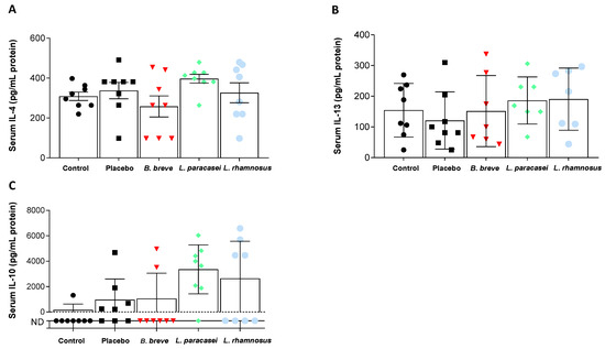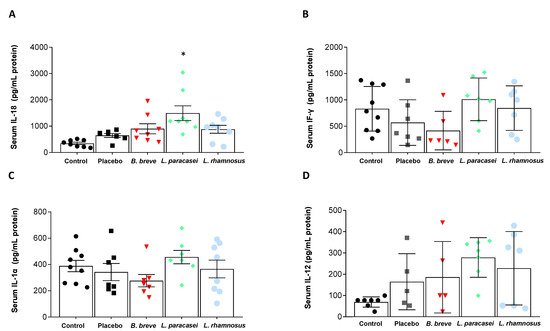 Circulating levels of pro-inflammatory (Figure 3) and anti-inflammatory (Figure 4) cytokines were also determined. Probiotics intake did not produce significant changes in serum IFN-γ, IL-1α and IL-12 compared with the placebo (Figure 3B–D). IL-18, however, increased in the serum of rats fed L. paracasei CNCM I-4034 (Figure 3A). Regarding anti-inflammatory cytokines, IL-4 increased in the L. paracasei group, although the difference with the placebo group did not reach statistical significance (p = 0.07, Figure 4A). IL-10 results are noteworthy (Figure 4C): although no statistical significance was reached, this IL tended to be higher with L. paracasei CNCM-I 4034 and L. rhamnosus CNCM-I 4036 treatments, the reason probably being that the number of rats (out of 7–8/group) where this cytokine was detected was much higher in the latter groups (control: 1 of 8 rats; placebo: 5 of 8; B. breve: 2 of 8; L. paracasei: 7 of 8; L. rhamnosus: 4 of 8).