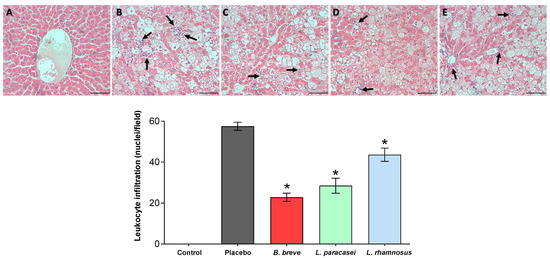 Inflammatory cell infiltration. Upper panels: Representative micrographs of 5-µm-thick liver sections stained with hematoxylin and eosin (H&E) of (A) control group, (B) placebo group, (C) B. breve group, (D) L. paracasei group, and (E) L. rhamnosus group. Bars = 20 µm. Lower panel: Quantification corresponding to the stained sections. Values are the means ± SEM, n = 3–4 per group. * p < 0.05 vs. placebo. B, Bifidobacterium; L, Lactobacillus.