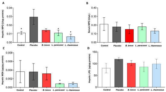 Hepatic levels of (A) MPO, (C) MDA and (D) LPS, and serum levels of MPO (B) of rats fed either with placebo, B. breve CNCM I-4035, L. paracasei CNCM I-4034 or L. rhamnosus CNCM I-4036 for 30 days. Values are the means SEM, n = 3–5 per group. * p < 0.05 vs. placebo. B, Bifidobacterium; L, Lactobacillus; LPS, lipopolysaccharide; MDA, malondialdehyde; MPO, myeloperoxidase.
