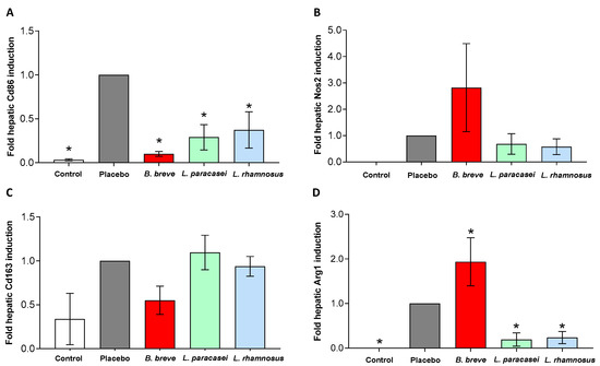 Macrophages are recognized to exist as two distinct subtypes, M1 pro-inflammatory and M2 anti-inflammatory [6]. We investigated whether L. paracasei CNCM I-4034, B. breve CNCM I-4035 and L. rhamnosus CNCM I-4036 could affect the distribution of both subtypes of macrophages in the rats’ livers. We measured Cd86 and Nos2 mRNA levels as markers of M1 macrophages (Figure 7A,B), and Cd163 and Arg1 as M2 markers (Figure 7C,D) by qRT-PCR. Administration of the placebo resulted in an induction of Cd86 mRNA in the liver (Figure 7A), and feeding with all three probiotic strains for 30 days significantly down-regulated Cd86 expression (Figure 7A). We did not find differences in Nos2 (Figure 7B) and Cd163 (Figure 7C) among groups. Arg1 mRNA was up-regulated with B. breve, whereas administration of L. paracasei CNCM I-4034 and L. rhamnosus CNCM I-4036 down-regulated Arg1 in the liver (Figure 7D).