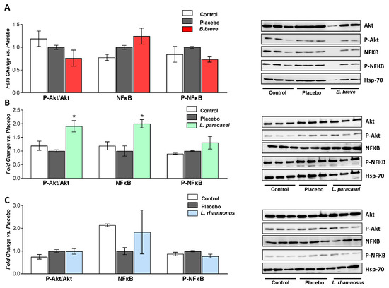 Western blot analysis of P-Akt/Akt ratio, NF-kB and P-NF-kB proteins of rats fed either placebo, (A) B. breve, (B) L. paracasei or (C) L. rhamnosus for 30 days. Hsp-70 was used as a loading control. Graphs on the left included 3 rats per group, and the right panels show representative blots. Values are the means ± SEM. * p < 0.05 vs. placebo. Akt, protein kinase B; B, Bifidobacterium; Hsp70, 70 KD heat shock protein; L, Lactobacillus. NF-κB, nuclear factor kappa-light-chain-enhancer of activated B cells; P-Akt, phosphorylated protein kinase B; P-NF-kB, phosphorylated nuclear factor kappa-light-chain-enhancer of activated B cells.