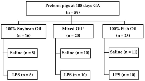 Experimental study design. Pigs were delivered 7 days preterm and received total parenteral nutrition for 11 days. On day 11, pigs received either LPS (lyophilized E. Coli) or saline. 1Mixed oil contains: 30% soybean oil, 30% medium chain triglycerides, 25% olive oil, 15% fish oil. GA, gestational age; LPS, lipopolysaccharide.