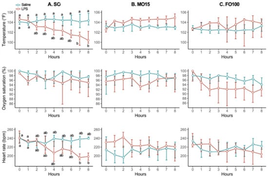 Vital sign changes in pigs during LPS challenge. Hourly recordings in temperature, oxygen saturation, and heart rate by lipid group, SO (A, n = 16), MO (B, n = 20), and FO100 (C, n = 23) lipid groups. Data was presented as line plot showing median and IQR. Groups without common letters are significantly different (p < 0.05). FO100, 100 percent fish oil; LPS, lipopolysaccharide; MO15, mixed oil with 15% fish oil; SO, 100% soybean oil.