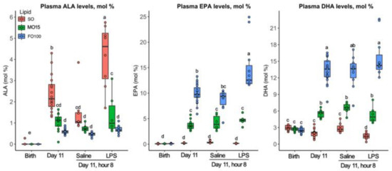 Specific plasma n-3 fatty acid profiles across postnatal age as a function of lipid group. Concentrations of fatty acids were determined by GC-MS and are presented as mol% in the form of boxplots with dots. Data show median and IQR. At day 11, pigs in each lipid group received either LPS or saline, and fatty acid levels were measured at 8 h at the end of the continuous infusion. Labeled points without a common letter represent a statistically significant difference of p < 0.05. ALA, α-linolenic acid; DHA, docosahexaenoic acid; EPA, eicosapentaenoic acid; FO100, 100 percent fish oil; MO15, mixed oil with 15% fish oil; SO, 100% soybean oil.