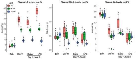 Specific plasma n-6 fatty acid profiles across postnatal age as a function of lipid group. Concentrations of fatty acids were determined by GC-MS and are presented as mol% in the form of boxplots with dots. Data show median and IQR. At day 11, pigs in each lipid group received either LPS or Saline, and fatty acid levels were measured at 8 h at the end of the continuous infusion. Labeled points without a common letter represent a statistically significant difference of p < 0.05. AA, arachidonic acid; DGLA, dihomo-γ linolenic acid; FO100, 100 percent fish oil; LA, linoleic acid; MO15, mixed oil with 15% fish oil; SO, 100% soybean oil.
