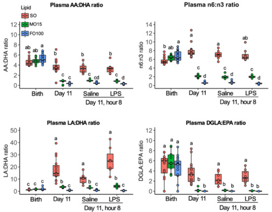 Plasma fatty acid ratios across postnatal age as a function of lipid group. Concentrations of fatty acids were determined by GC-MS and are presented as mol% in the form of boxplots with dots. Data show median and IQR. At day 11, pigs in each lipid group received either LPS or Saline, and fatty acid levels were measured at 8 h at the end of the continuous infusion. Labeled points without a common letter represent a statistically significant difference of p < 0.05. AA, arachidonic acid; DGLA, dihomo-γ linolenic acid; EPA, eicosapentaenoic acid; FO100, 100 percent fish oil; LA, linoleic acid; MO15, mixed oil with 15% fish oil; n-3, omega-3, n-6, omega-6; SO, 100% soybean oil.