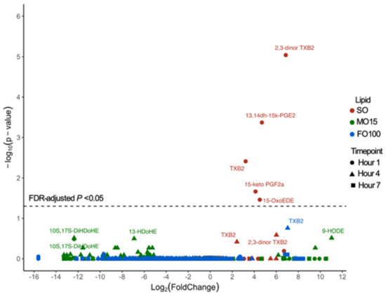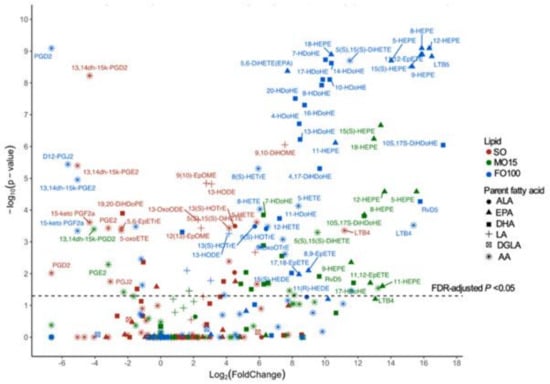 Changes in plasma oxylipins at day 11 compared to day zero (priming stage) by lipid group, SO (n = 10), MO15 (n = 9), and FO100 (n = 10). Scatter plot shows the median fold change of oxylipins within each lipid group indicated by colors and parent fatty acids of the oxylipins indicated by shapes. AA, arachidonic acid; ALA, α-linolenic acid; DGLA, dihomo-γ linolenic acid; DHA, docosahexaenoic acid; EPA, eicosapentaenoic acid; FO100, 100 percent fish oil; LA, linoleic acid; MO15, mixed oil with 15% fish oil; SO, 100% soybean oil.
