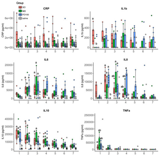 Plasma levels of C-reactive protein (CRP), interleukin (IL)-1b, IL-6, IL-8, IL-10 and tumor necrosis factor (TNF)-α by lipid group, (SO (n = 8), MO15 (n = 6), and FO100 (n = 11), recorded hourly after the introduction of lipopolysaccharide on day 11. Data show median and IQR. Labeled points without a common letter represent a statistically significant difference of p < 0.05. FO100, 100 percent fish oil; MO15, mixed oil with 15% fish oil; SO, 100% soybean oil.