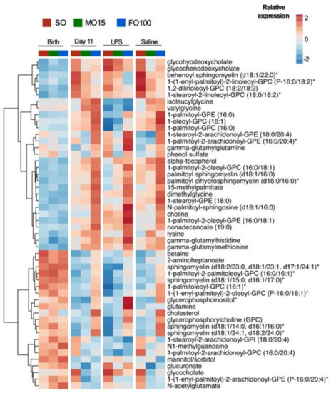 Metabolomic profiles of 313 unique plasma metabolites were measured at birth and day 11 before and after LPS treatment, and the top 50 significant metabolites are shown as a heatmap in Figure 9. At birth, the relative expression of metabolites was similar in all three-lipid groups. However, at day 11, metabolites differed by lipid groups, with increased choline and its downstream glycerophospholipids and sphingomyelin metabolites in FO100 compared to MO15 and SO lipid groups. LPS treatment showed similar metabolomic profiles compared to saline treatment within lipid groups.