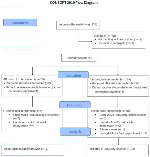 At the end of the intervention, the rate of retention for Group A was 79%, with 74% for Group B. Thus, the dropout rate was 24%, and, of the children who remained in the study, 98% provided data for analyses. Three adverse events (gastrointestinal issues) were reported from two participants in Group A and one participant in Group B. Of these, one participant in Group B withdrew while the other two continued in the study.