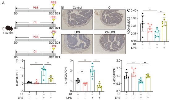 In this study, we used LPS to induce intestinal inflammation and dysfunction. To investigate the effects of Ct on attenuating colonic inflammation and barrier dysfunction in mice, we administered 108 CFU/mL Ct by gavage for 20 days, followed by intraperitoneal injection with LPS (10 mg/kg BW) for 24 h (Figure 1A). We first evaluated the effects of Ct on the expression of MUC2 using immunohistochemistry. No significant differences were showed between mice treated with PBS (control) and Ct alone (p = 0.1710, Figure 1B,C). Compared with mice injected with LPS alone, the expression of MUC2 was increased in mice pretreated with Ct (p < 0.01, Figure 1B,C).