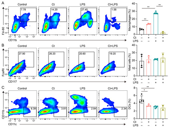 Effects of Ct on proportions of macrophages, mast cells, and dendritic cells (DCs) in mice. (A) Proportion of macrophages; (B) proportion of mast cells; (c) proportion of DCs. Each dot presented one mouse. Data presented as mean ± SEM. * p < 0.05, ** p < 0.01 by two-way unpaired t-tests.