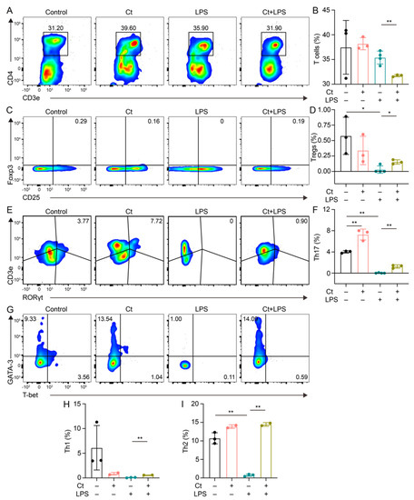 T cell subsets were then analyzed in this study. We found that Ct enhanced the proportion of Th17 cells (p < 0.01, Figure 3E,F), but had no effects on other T cell subsets including Tregs, Th1, and Th2 cells (p > 0.05, Figure 3C,D,G–I), compared with the control. Under the inflammatory condition, the proportions of both Tregs and Th17 cells were increased in the mice pretreated with Ct under inflamed condition, compared with mice injected with LPS alone (p < 0.05, p < 0.01, respectively, Figure 3C–F. Moreover, compared with mice injected with LPS, the proportions of both Th1 and Th2 were enhanced in mice pretreated with Ct (p < 0.01, Figure 3G–I).