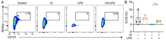 The proportion of ILC3s was analyzed in this study. As shown in Figure 4, the supplementation of Ct had no effect on ILC3s proportion, compared with mice treated with PBS (p = 0.9754). However, the proportion of ILC3s was enhanced in mice pretreated with Ct, compared with mice injected with LPS (p < 0.01).