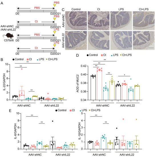 The mRNA expression of IL-22 was decreased in mice injected with AAV-shIL22, compared with mice injected with AAV-shNC (p < 0.01, Figure 5B), indicating that IL-22 was successfully knocked down in mice after injecting with AAV-shIL22 for two weeks. In the mice injected with AAV-shNC, the mRNA expression of IL-22 was enhanced in mice pretreated with Ct, compared with mice injected with LPS (p < 0.01, Figure 5B). However, after knocking down IL-22 in vivo, no significant differences could be observed in the mRNA expression of IL-22 among the treatments (Figure 5B).