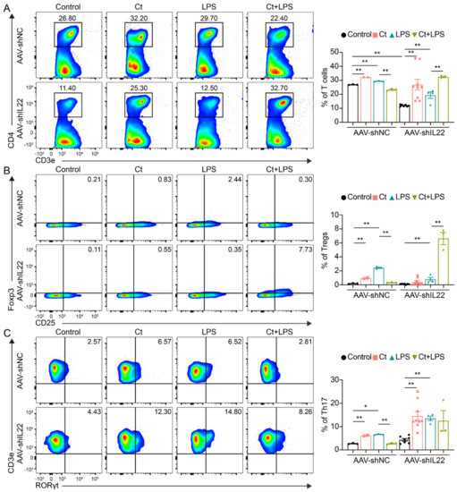 As shown in Figure 7, in AAV-shNC-treated mice, supplementation of Ct alone increased the proportions of T cells, Tregs, and Th17 cells compared with mice treated with PBS (control) (p < 0.01). Moreover, the proportions of T cells, Tregs, and Th17 cells were decreased in mice pretreated with Ct compared with mice treated with LPS (p < 0.01). After knocking down IL-22, compared with the AAV-shIL22-treated mice injected with LPS, the proportions of T cells and Tregs were significantly increased in mice pretreated with Ct (p < 0.01). However, no significant differences were observed in the proportion of Th17 cells between AAV-shIL22-treated mice injected with LPS alone and pre-supplemented with Ct.
