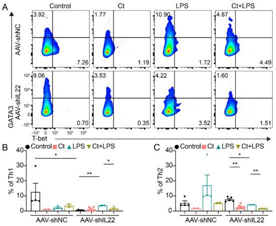 As shown in Figure 8, no significant differences could be observed in mice injected with AAV-shNC among the treatments. However, after knocking down IL-22 in vivo, the proportion of Th2 was decreased in mice treated with Ct alone compared with the control (p < 0.01). In addition, the proportions of Th1 and Th2 were decreased in mice pretreated with Ct, compared with mice injected with LPS (p < 0.05, p < 0.01, respectively).