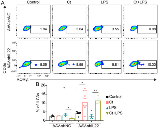 In AAV-shNC-treated mice, the proportion of ILC3 was decreased in mice pretreated with Ct compared with this in mice injected with LPS (p < 0.05, Figure 9). After knocking down IL-22, Ct enhanced the proportion of ILC3, compared with the control (p < 0.05). Moreover, the proportion of ILC3s was enhanced in mice pre-supplemented with Ct, compared with mice treated with LPS (p < 0.01, Figure 9).