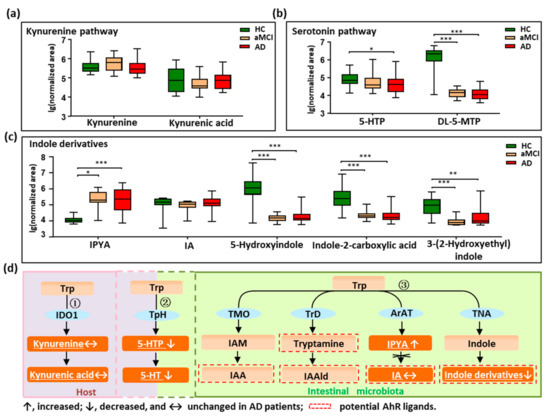 Dysregulation of fecal tryptophan metabolic pathway in AD patients. (a–c) Comparison of detected tryptophan metabolites in the kynurenine pathway, serotonin pathway, and indole derivatives among AD, aMCI, and HC groups. (d) There are three major tryptophan metabolism pathways: ① Kynurenine pathway mainly occurs in the liver or extrahepatic organs; ② Although neurotransmitter serotonin (5-hydroxytryptamine [5-HT]) can be synthesized in the brain, 90% of the body’s 5-HT is produced in the gut; ③ Tryptophan was directly transformed into indole and its derivatives in the gut controlled by gut microbiota, and many of the indole derivatives are potential AhR ligands. The detected tryptophan metabolites in the current study were marked with a white color and underlined. Note: Data are given as median with range. p values were determined by one-way ANOVA or Kruskal–Wallis test. * p < 0.05; ** p < 0.01; *** p < 0.001. Abbreviations: Trp, tryptophan; IDO1, indoleamine 2,3-dioxygenase 1; TpH, tryptophan hydroxylase; TMO, tryptophan 2-monooxygenase; TrD, tryptophan decarboxylase; ArAT, aromatic amino acid aminotransferases; TNA, tryptophanase; 5-HTP, 5-hydroxytryptophan; DL-5-MTP, DL-5-methoxytryptophan; IAM, indole-3-acetamide; IAA, indole acetic acid; IAAld, indole-3-acetaldehyde; IPYA, indole-3-pyruvic acid; IA, indoleacrylic acid; AhR, aryl hydrocarbon receptor.